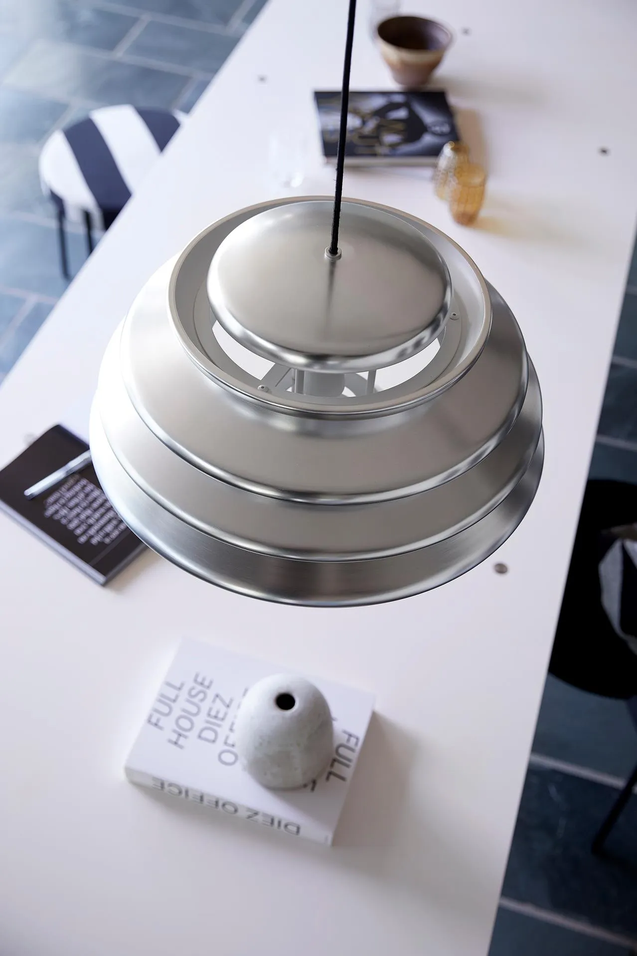 Made of multiple concentric shades of varying size, the layered design of the pendant offers a very characteristic and sculptural quality while ensuring a 100% glare-free light. The fixture emits a generous downward light that is complimented by a soft and diffused lateral light. Like with much of Panton’s lighting designs, the unique and expressive idiom of the HIVE pendant demand attention even with the lights off.