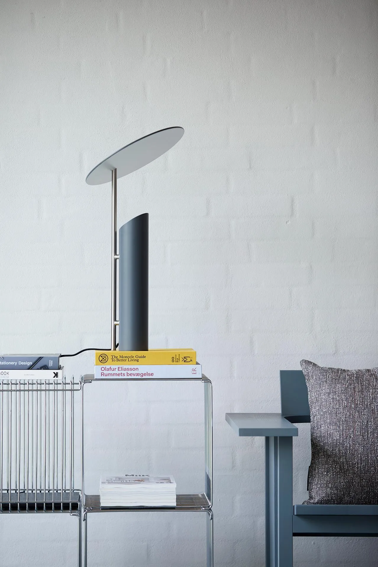 With REFLECT, light is cast upwards from the tubular base and reflected off the white surface of the slanted disc-shaped shade to create a crisp yet diffused light throughout its surroundings.