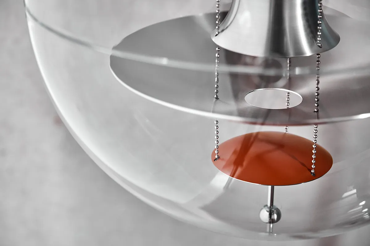 Conceived in 1969 by Verner Panton, the VP Globe is arguably the most recognized Panton lighting design. The decorative pendant features a crystal clear transparent acrylic outer-shell with five internal reflector shades suspended by delicate steel chains.