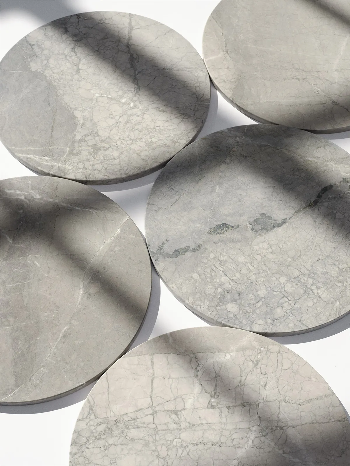 As a natural focal point of the home, the Midst Table and the Midst Coffee Table are generous tables where friends and family gather – with room to welcome more. The refined silhouette is simple yet distinctive, featuring a monolithic spun-steel base with a high-gloss finish contrasting elegantly with the honed grey marble tabletop. The deep grey stone, intricate veining, and subtle blue undertones bring a refined touch to any setting.