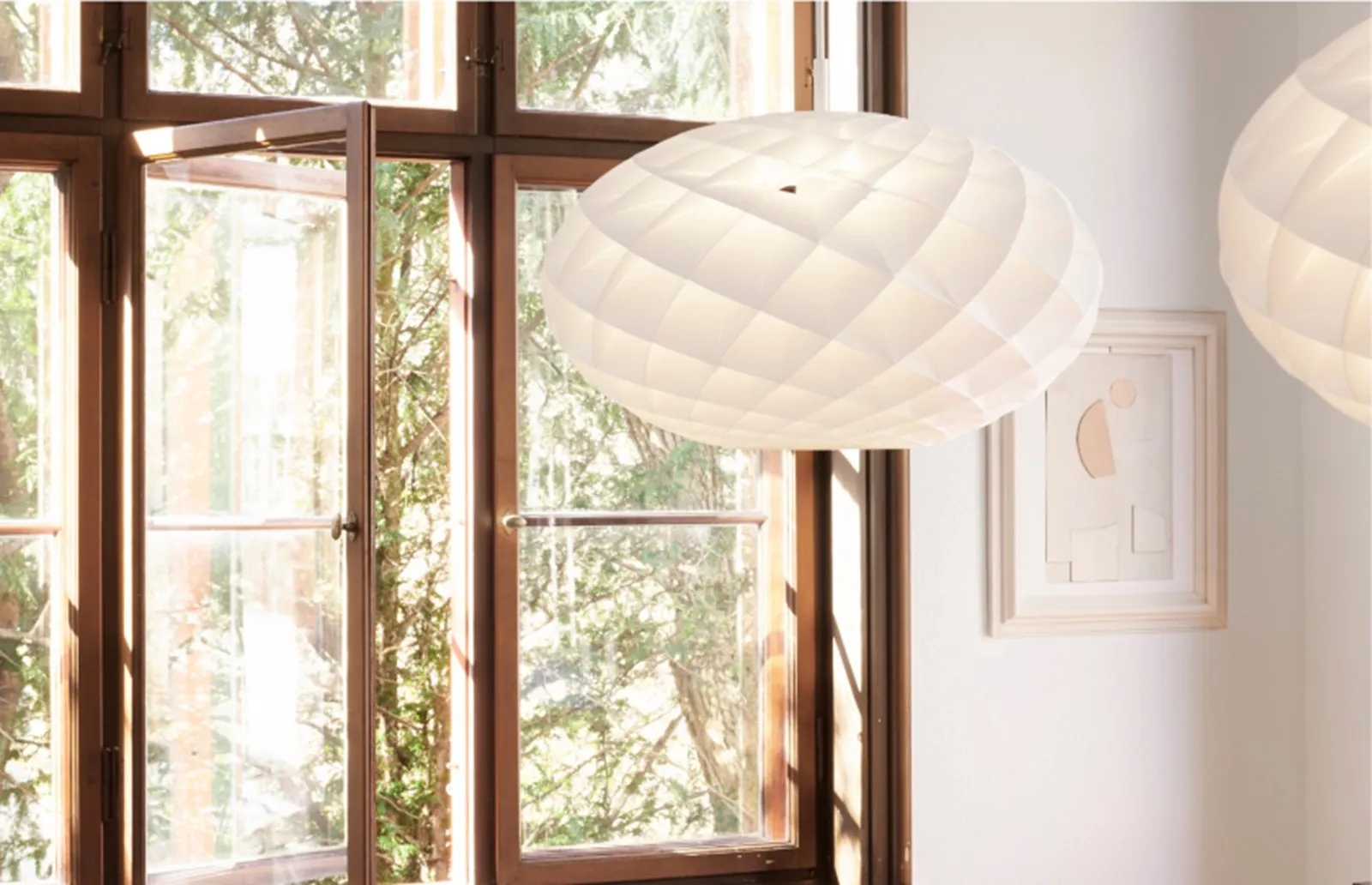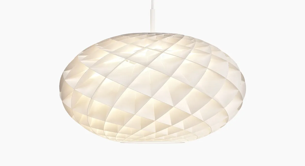 Patera Oval, an ellipsoid pendant, which completes the Patera family designed by Øivind Slaatto. Following the same elegant design principles and captivating Fibonacci structure as the classic Patera, the new oval pendant brings the Patera range to new applications where ceiling heights are limited, or a flat circular form is preferred.