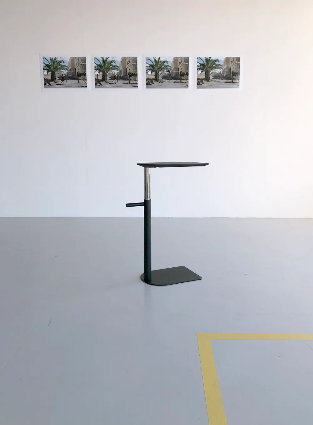 Hight-adjustable table with table top in wood or laminate and base in metal.