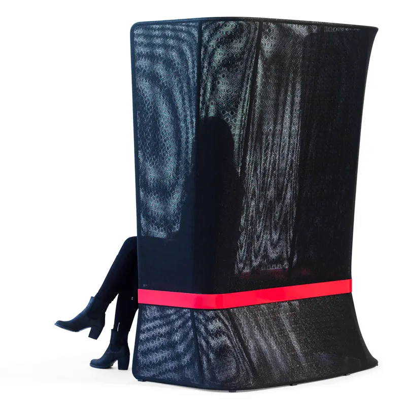 Combined room divider and seating that can easily adapt to contemporary architecture with open spaces. A piece of furniture that could divide rooms without being clumsy. Creating a secluded space just for you; with or without a friend, and easily blend in at the busiest restaurant or convention centre as well as the most quiet library…and of course, be effortlessly disassembled and stacked away when not needed. The light “corset-like” structure is covered with a translucent fabric and held in place by the belt. And, thanks to its translucent mesh fabric, you will never have the feeling of being entirely isolated from the surrounding environment and can instead always choose to be a part of what is going on around you..