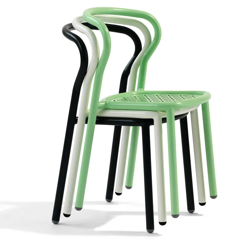The bent tubular steel has been heralded as the symbol of modernity in furniture design ever since the radical innovations designed by Mart Stam and Marcel Breuer in the 1920’s. The industrial technique completely innovated household design and matured to an undisputed iconic element of design vocabulary. “Straw” is a homage to classic tubular steel furniture by visually and physically challenging tradition and implementing controversial detail into the canon of the design: The kinked tube. The kink, being the most immediate way to deform a tube, revolutionises the aesthetic appearance of tubular steel. Its disciplined character is contradicted; the objects seem spontaneous as if folded by hand.