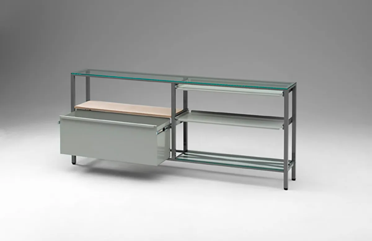 Drawer unit, steel frame, glass desk top, oak shelf.