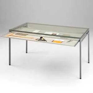 Writing desk. Glass top with substructure in varnished (coated) steel, fully extendable drawer of cassette type.
