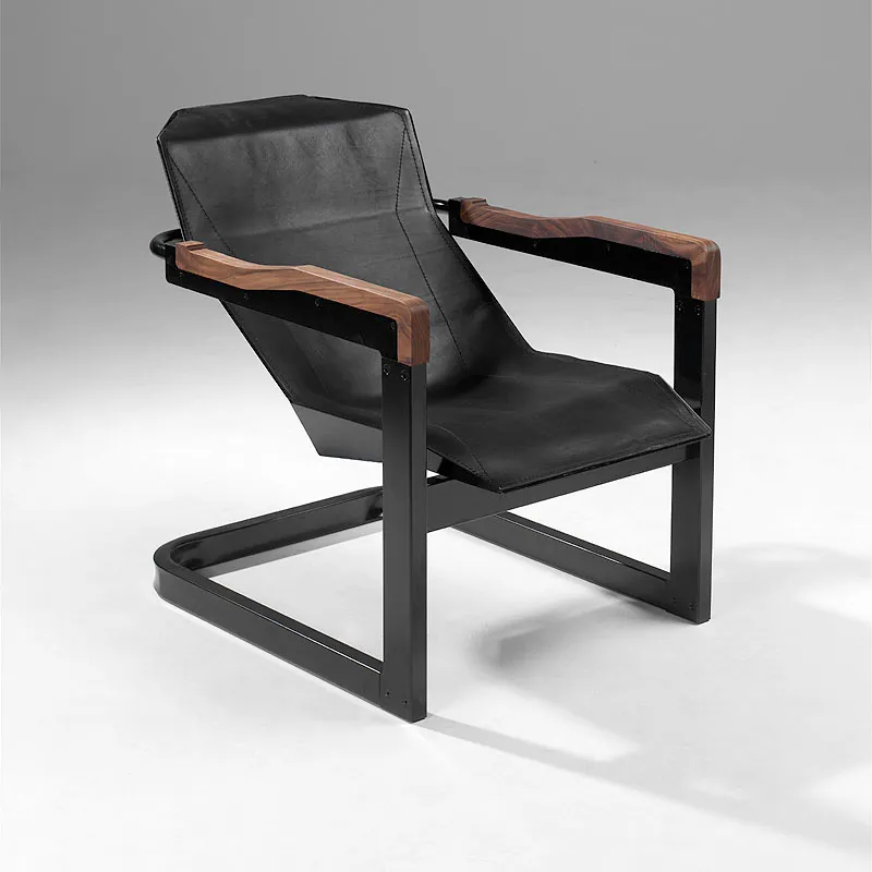 Material: Laser cut steel frame, seat in stealth technic, last-formed prime leather, armrests in ash, oak or walnut.