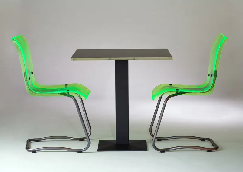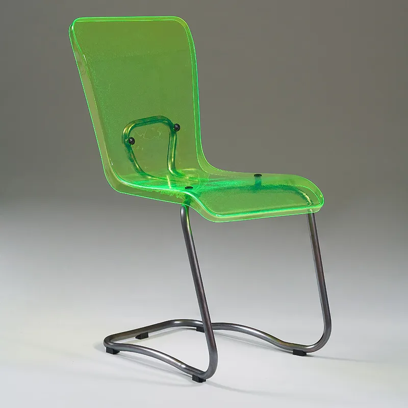 steel frame, seat in tranparent plastic. h 82 w 51, d 50 cm.