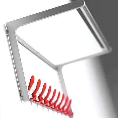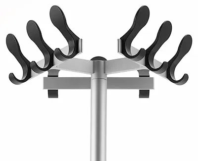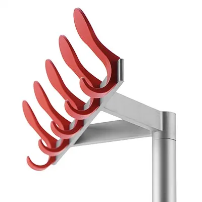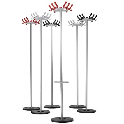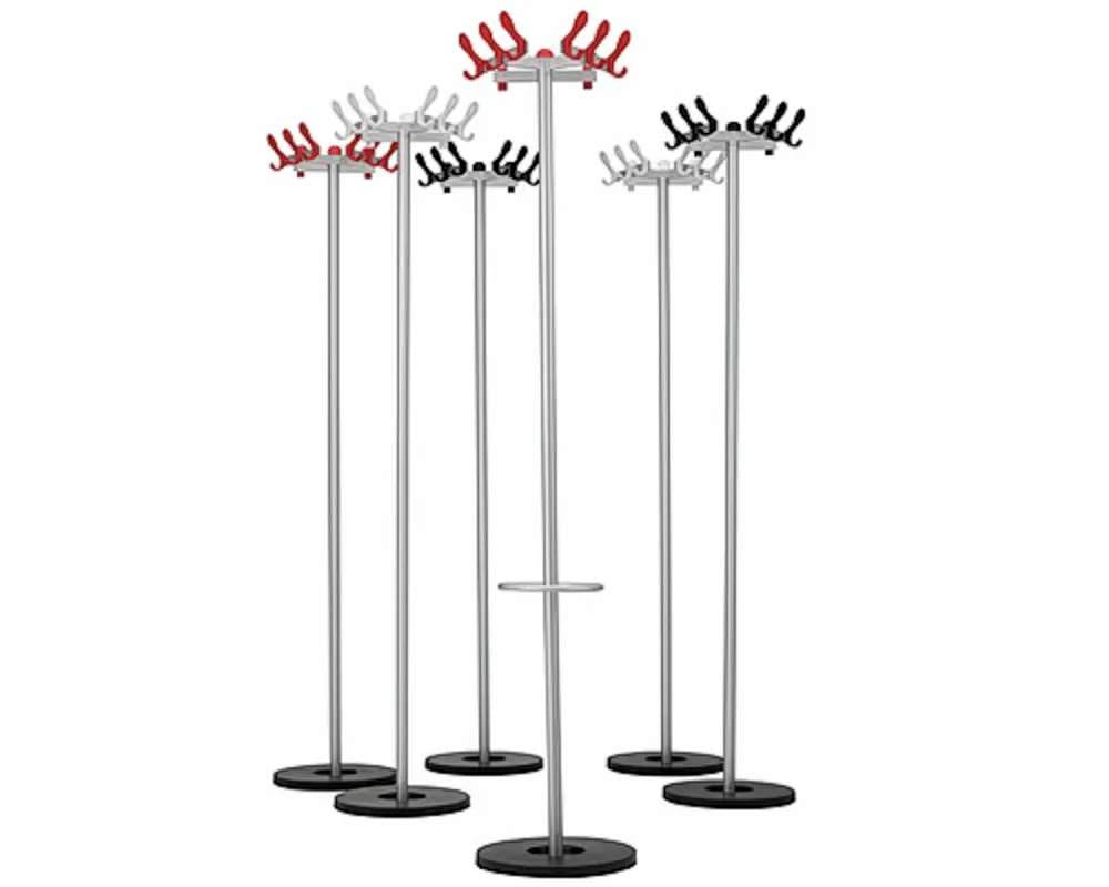 Stand By, a new departure on traditional floor-mounted coat stands, comes in two versions: freestanding with a rotating, triangular hanging rack, and a single-sided version for use where minimal space is available, as for example against a wall. Umbrella storage is an option on both versions. Plastic hooks in an assortment of colours are affixed to the hanging racks.