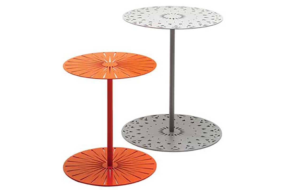 Introducing coffeetable Cake and sideboard Sun, Monica Förster has created tables inspired by the shapes of nature; snow crystles and sun beams. Reminiscent of pastery paper, the disc and the base made in laser cut metal sheet, catches light and casts shadows with magic and dramatic shapes.The tables come in different heights and finishings, and are flexible to use for both outside and inside environments.