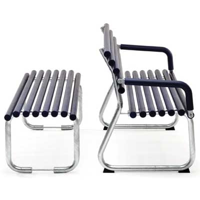 With the sofa and bench Goal, Thomas Bernstrand has, in a personal way, made a heavy and solid outdoor furniture. The laths of tubular steel and thick rubbercoating made out of PUR makes the seating comfortable in all kinds of weather. The usage of PUR Is commonly used in playground equipment for Its durability and softness combined. Goal Is an exiting alternative to the more traditional suite of furniture made out of steel and wood.