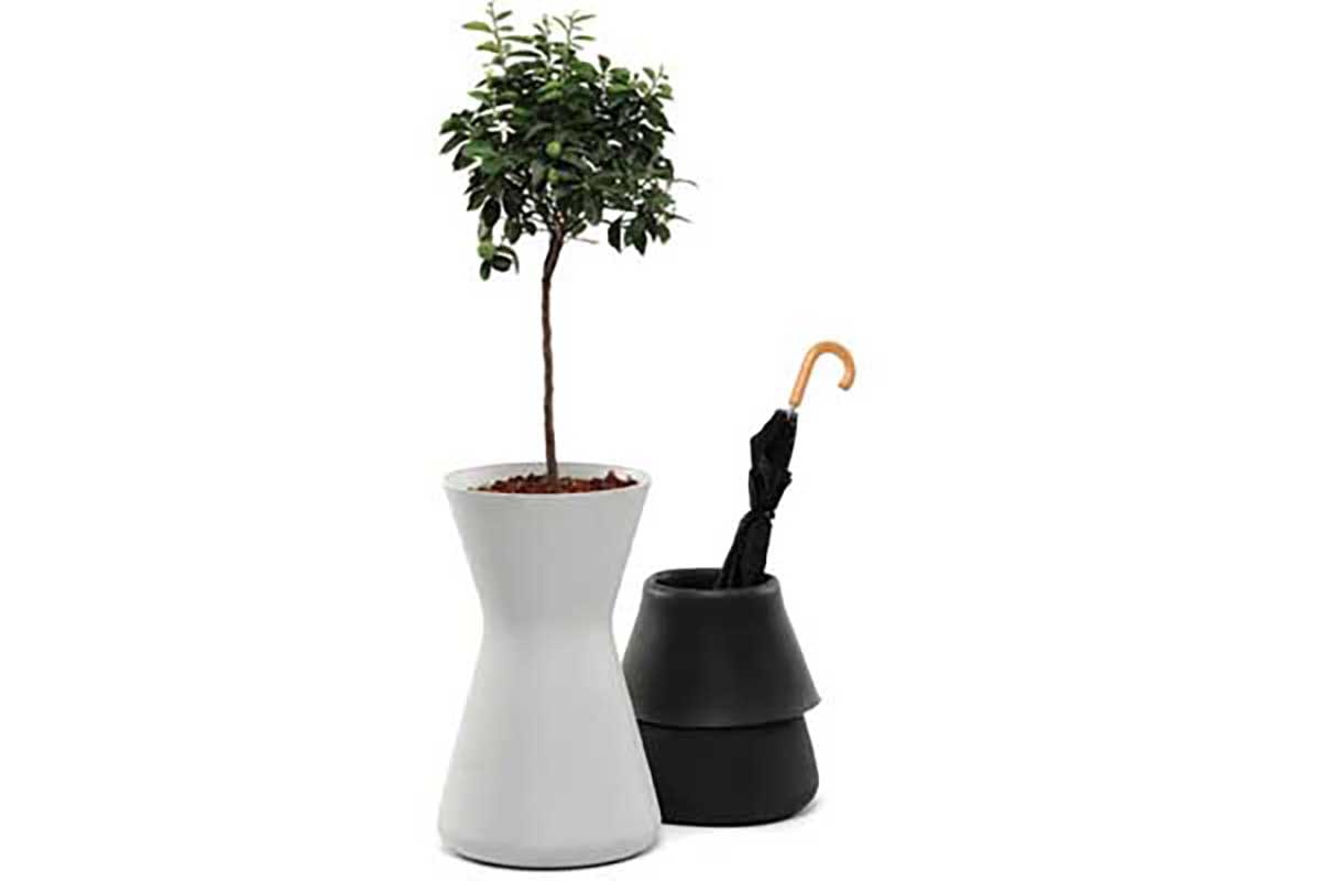 Imagine a huge rubber vase, with a thick bottom to stand strong winds, and you end up with the planter Tall. The reliable construction covers the plants from both heat and cold. Additionally, it can be turned in to an umbrella rack, by simply folding the edges. Let the forms of Tall, and the plants it houses, guide you through the lobby, on to the office and out on the terrace.
