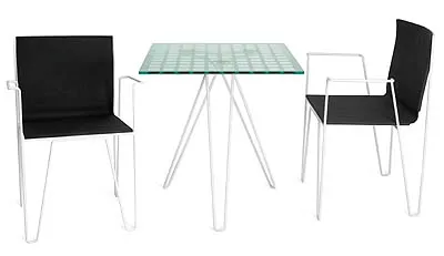 design Mats Aldén. With references to the traditional iron thread kitchen tools, Wire was made to be functional and durable. With a soft and comfortable seating in cast “rubber-like” polyeurethane and a table-top in laminated glass the coffée table set gives a light and elegant impression.