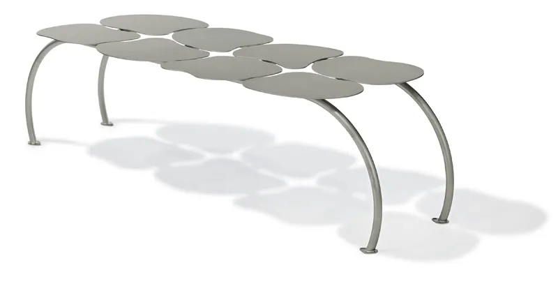This eye-catching bench was created by a designer who interprets furniture as sculptural form. The steel frame is crafted from arcing strips of curved steel, while the seating is made from eight irregular pieces. The seats’ organic contours recall the shapes of lily pads and leaves, making it a natural fit for a garden, courtyard or park. At the same time, the bench’s sleek profile is utterly contemporary, creating the kind of silhouette suited perfectly to streamlined architectural settings. With neither a front nor back, the bench is easy to place, and attractive from many vantage points.
