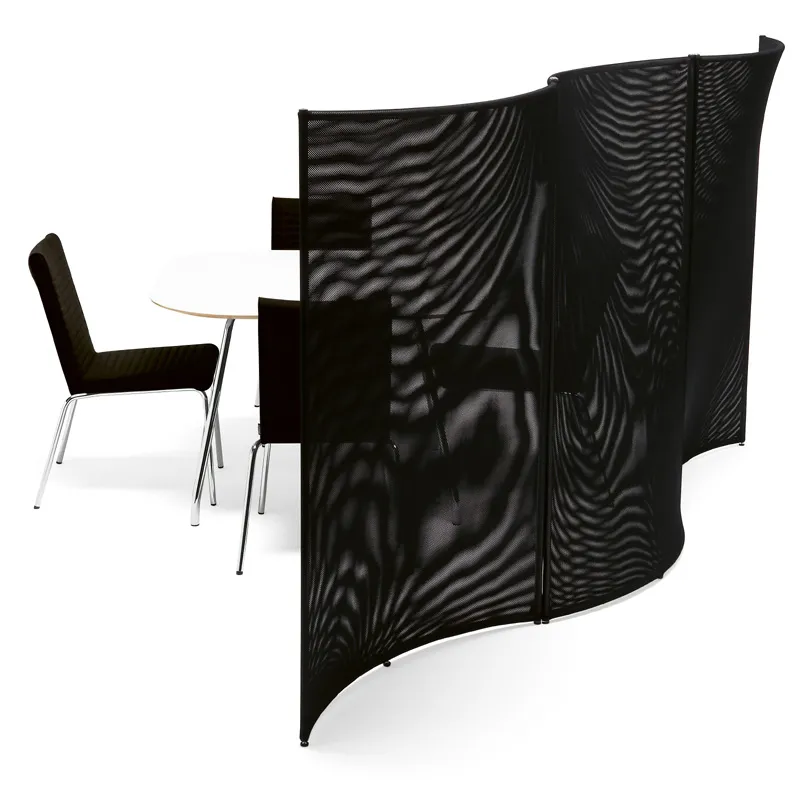 SPINNAKER has a metal frame with black transparent polyester fabric. The acoustic version has white 3D mesh fabric and furniture fabric 150 cm wide. Dimensions: 100 cm (width), 146 cm (height), 30 cm (depth).