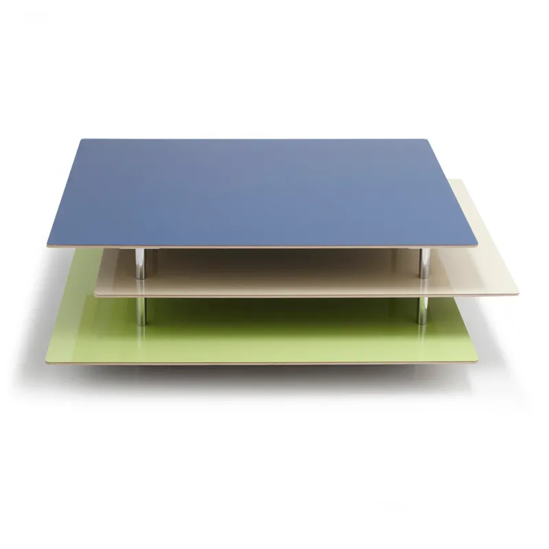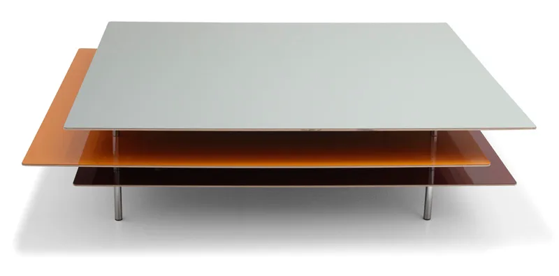 Etage consists of three coffee tables in different colors and sizes. At first glance, they appear to almost hover above the floor. The three table tops protrude in different directions like balconies, revealing their underlying architectural inspiration: the table is a mini-building without walls—a building under construction. The different levels create spaces for magazines and remote control devices.
