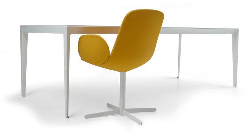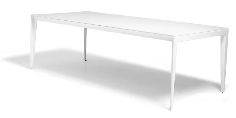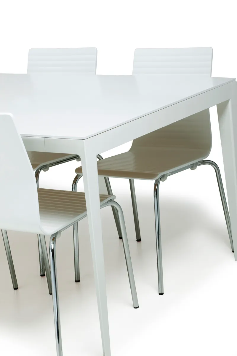 The Outline table measures 240 cm by 100 cm and is 73 cm in height. It is a large piece that can easily be extended by linking additional tables. Despite its size, it is relatively lightweight. The frame is metal, and the top is white through-dyed laminate. Though it consists of two parts, the table appears to have been produced as a single piece. Tolvanen drew his inspiration for the frame from a folded sheet of paper, to create the overall impression of ultra-thinness. If two Outline tables are placed side by side, it appears that they have only one leg, although there are actually two.