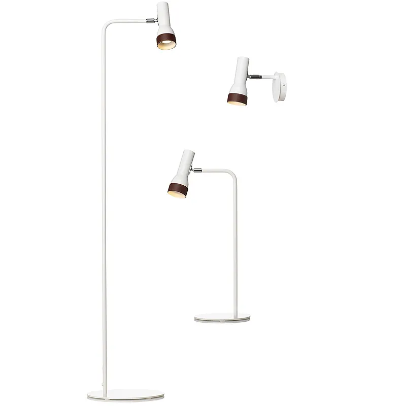 Talk bed lamp is designed and developed for Rica Talk Hotel nearby the Stockholm fair. Now, we also have a table and a flooor lamp. Talk is produced in white enamelled aluminium or in black structure lacquer and with a leather ring. The leather ring gives the lamp an elegant look as well as protecting from heat. The shape of the shade reminds of a torch. Light source: 20W 12V Halogen