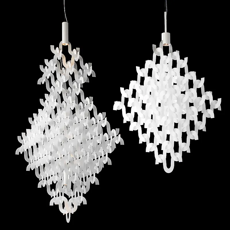 U Form is like a modern crystal chandelier and gives an interesting three-dimensional feeling. The shape changes when you move through the room. U Form is composed by cut out shapes. The ceiling lamp is produced in two sizes and the largest has a height of 1600 mm. The colours of U Form are white or clear plastic or rough brass and each one has its own expression. Light source: 3x35W MR16 (big) alt 1x35W MR11 (small)