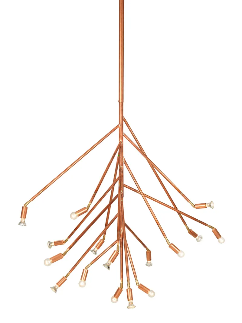 The twigs (Kvist in Swedish) of the birch are the inspiration behind this light. The material, rough copper, is a further nod to its foundation in nature. The distinct silver soldering of the arms give a rough expression but also show a good craftsmanship.