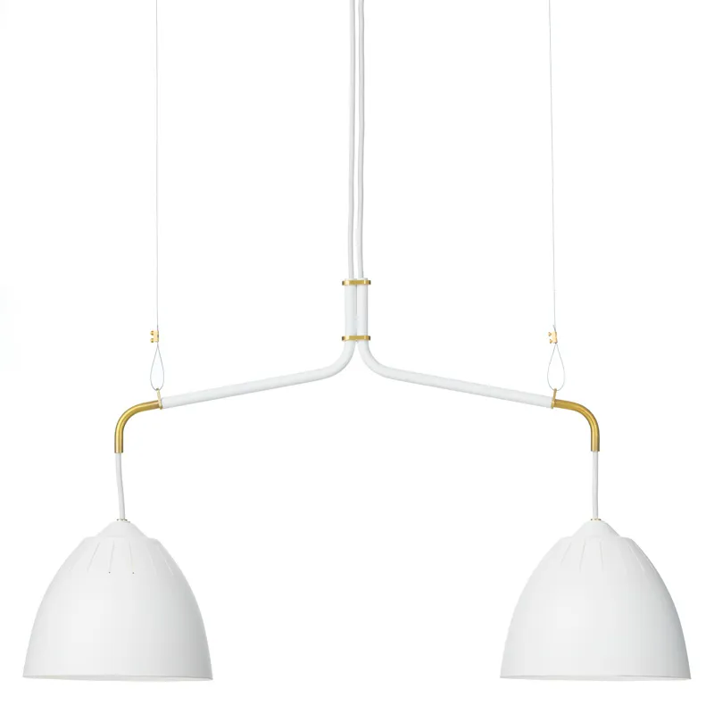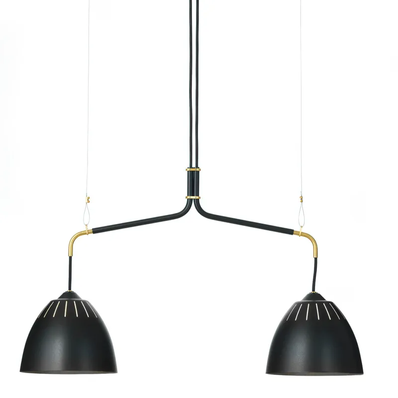 The pendant lamp completes the Lean family. The leaning expression for the Lean lamps is found in the declined vertical arm. The small solid pieces in rough brass which act as help for the hanging look like small jewels. The whole family has a retro-modern appeal but is produced in modern materials as powder coated metal, rough brass and a handle in rubber.
