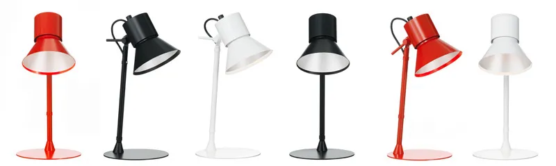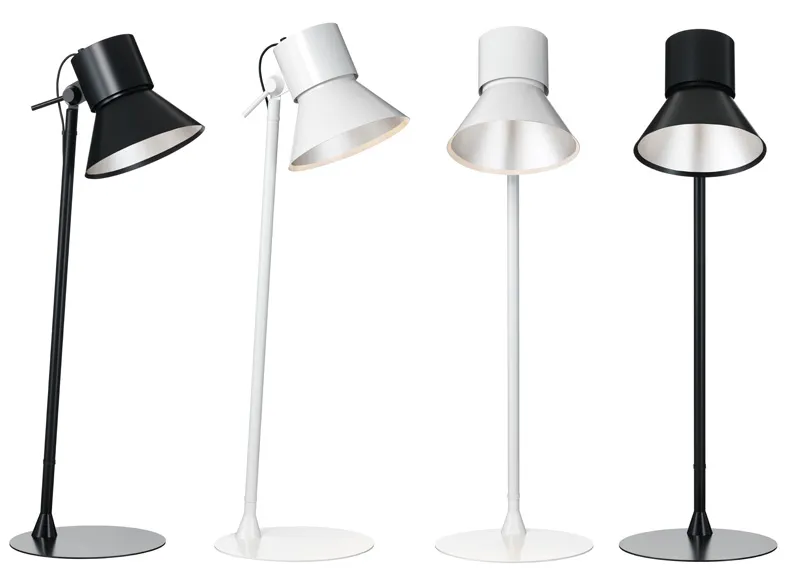 The Studio lamps take their inspiration from a photo studio. The lamps combine a heavy-duty look with large shades and a clip-on attachment for the lamp cords with refined details such as adjustment handles of solid steel. While the floor lamp has a simple “form follows function” approach the desk top version appears subtle and cultivated due to change in the scale.