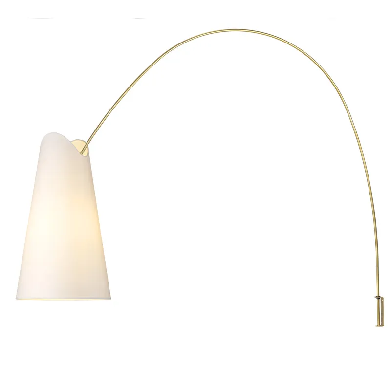 The Great White is a wall lamp in rough brass with an arched arm proportioned to allow people to walk underneath it. The lampshade, with the subtle curvature around its top is reminiscent of a big fish swallowing the bait.