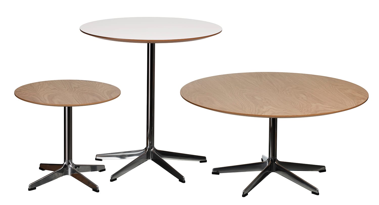 A table based on one of our environmentally friendly themes – the Swedese star base in recycled aluminium and table top in oak or white laminate. The Rondo table with the 4-star base comes in a height of 45 cm and table top in a diameter of 50 cm. The 5-star based table comes in heights of 45 and 72 cm and in diameters of 70 or 90 cm.