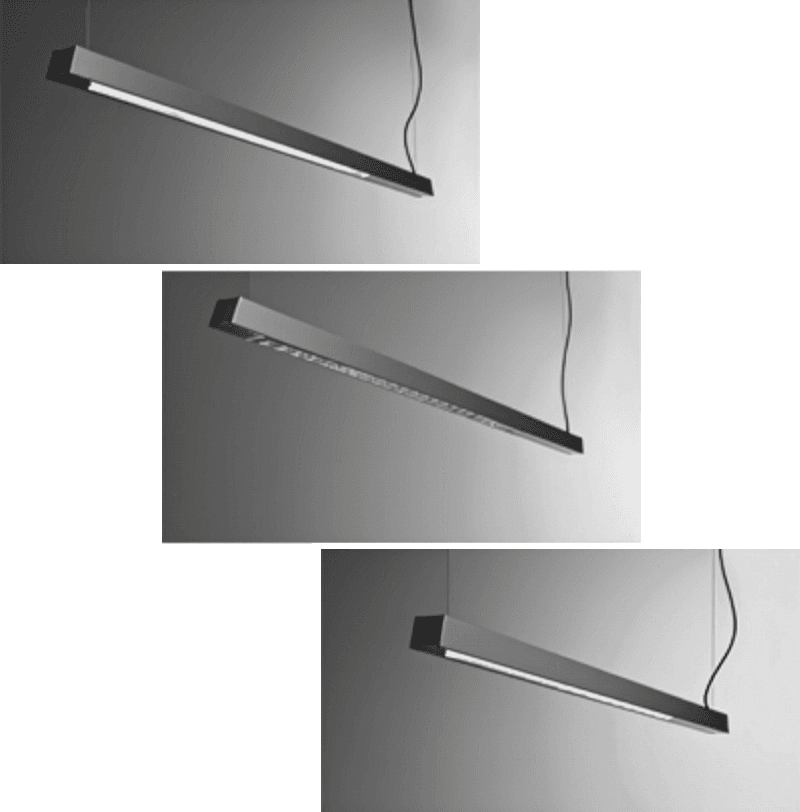 Suspended fitting, three variants. With T5 fluorescent tubes and lens optics or miro raster. Also available with LEDs. LINS is made of anodised aluminium.