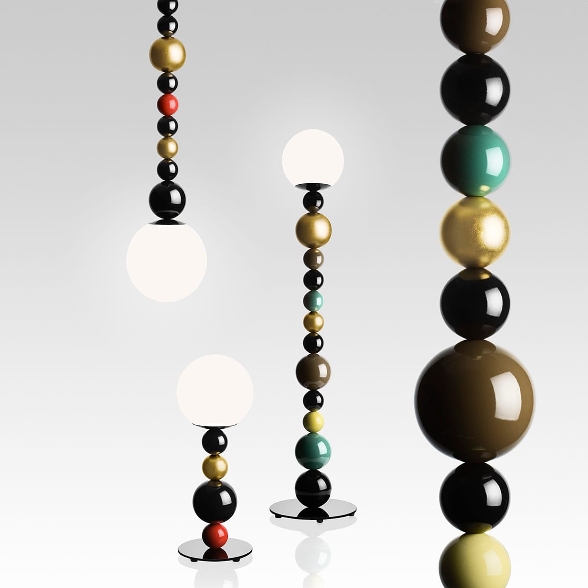 The new line RGB adorns the rooms with multi coloured and gold plated balls, stacked on one another and thread on a line like enlarged pearl ornaments. Zero presents RGB as floor, table and pendant fixture in three different colour combinations.