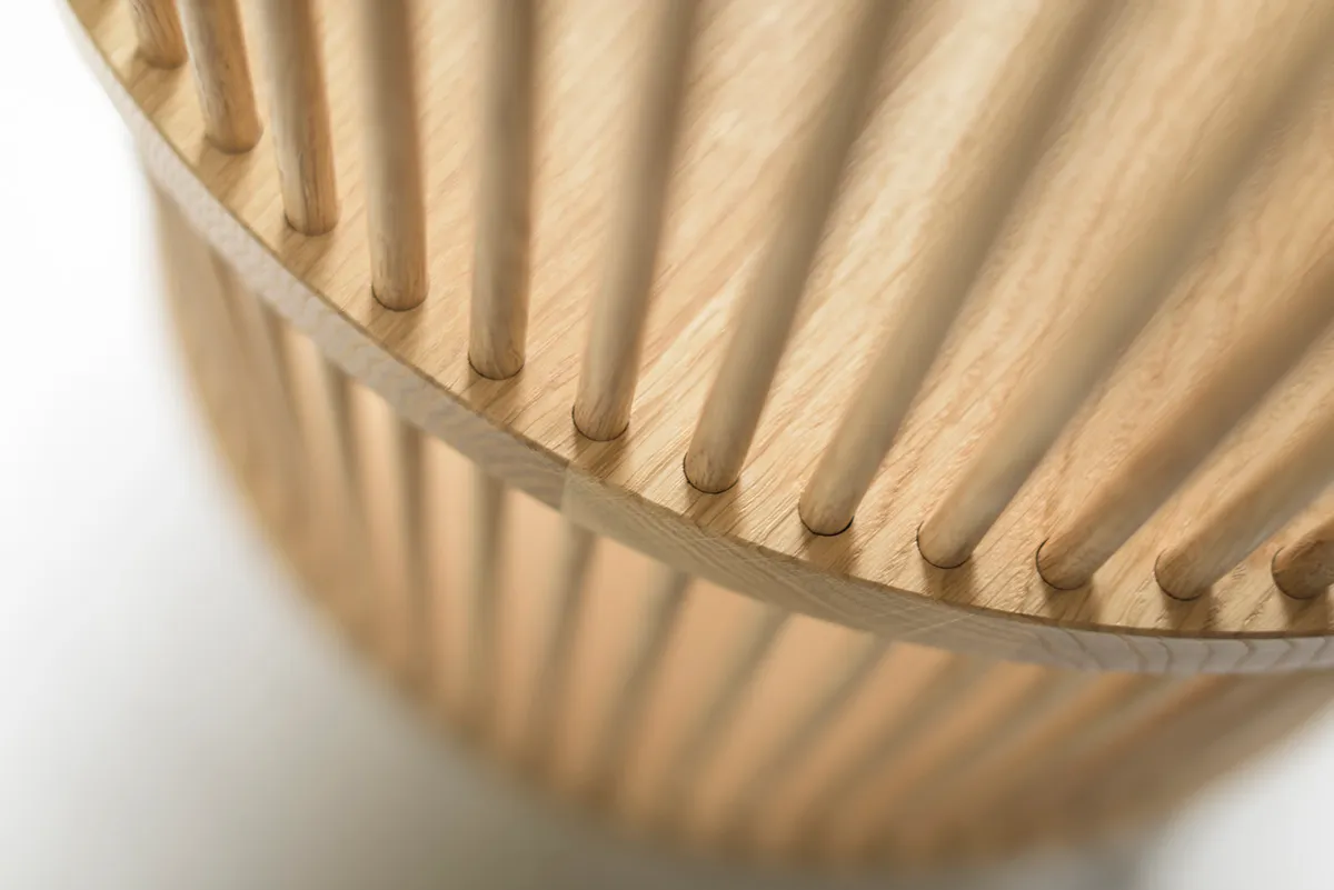 Detail view of Detalji bench's traditional joinery and Woodpecker paper yarn fabric by Ritva Puotila