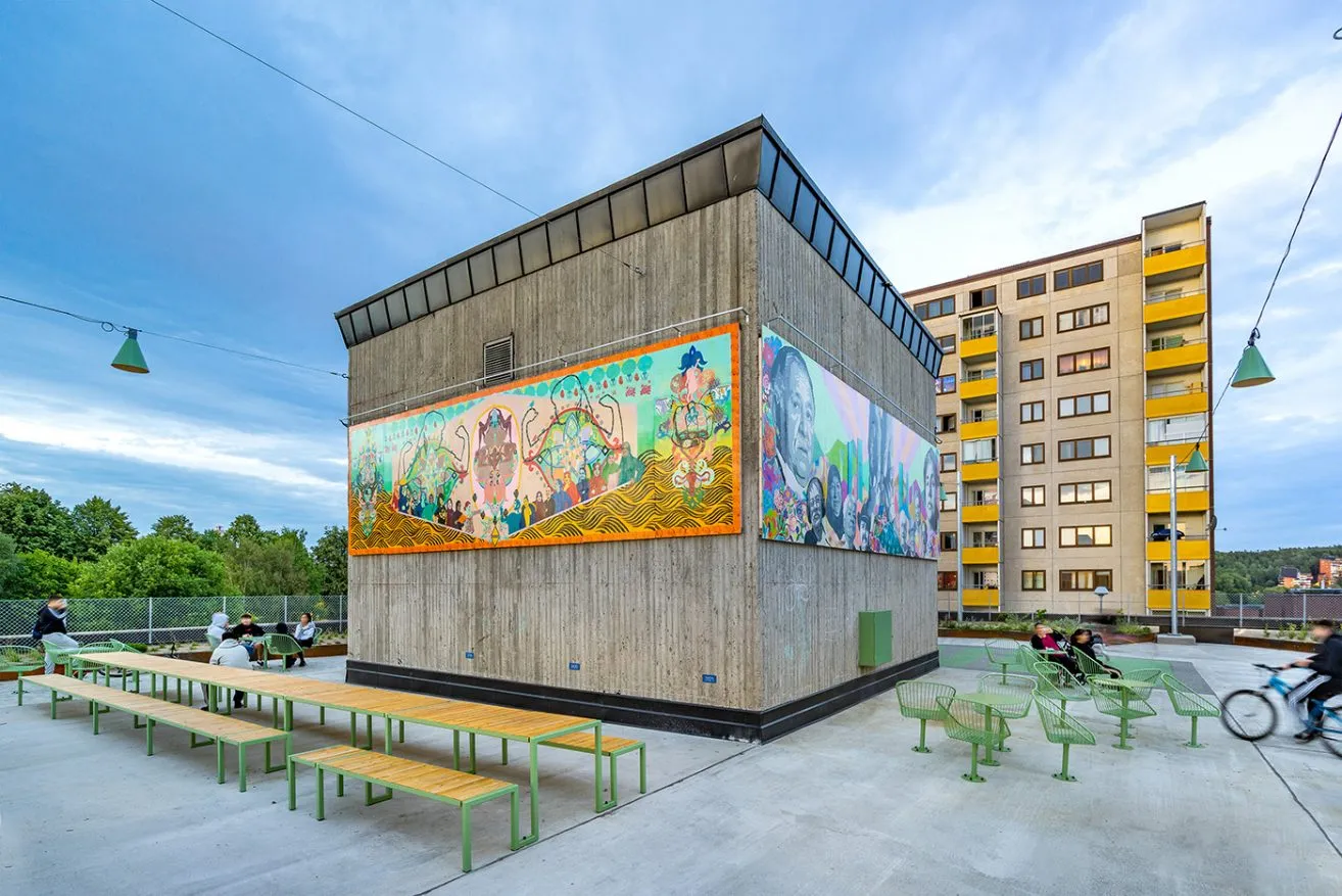 Botkyrkabyggen’s support for Konstkuben (art cube), the concrete cube and former automated vacuum waste collection system that stands in the middle of the site, is another part of the work intended to enhance well-being and security and to create a positive story about Fittja. Konstkuben has been used for art projects by artistic director Saadia Hussain, who has involved the municipality in Fittja and their stories in the works. The high-up location of the art around the cube makes the space visible from a distance and transforms it into a prominent and identity-creating site for the people of Fittja.