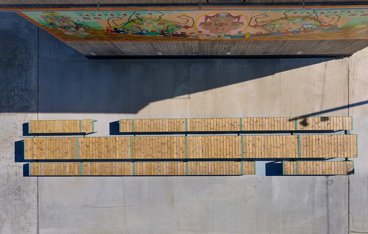 The constellation has an urban design with sustainable materials, which can withstand a harsh outdoor environment and changing climate. The colours in wood and steel are reflected in the works of art and surrounding architecture and contribute to a well-thought-out overall environment, which is characterised by good design in the public space.