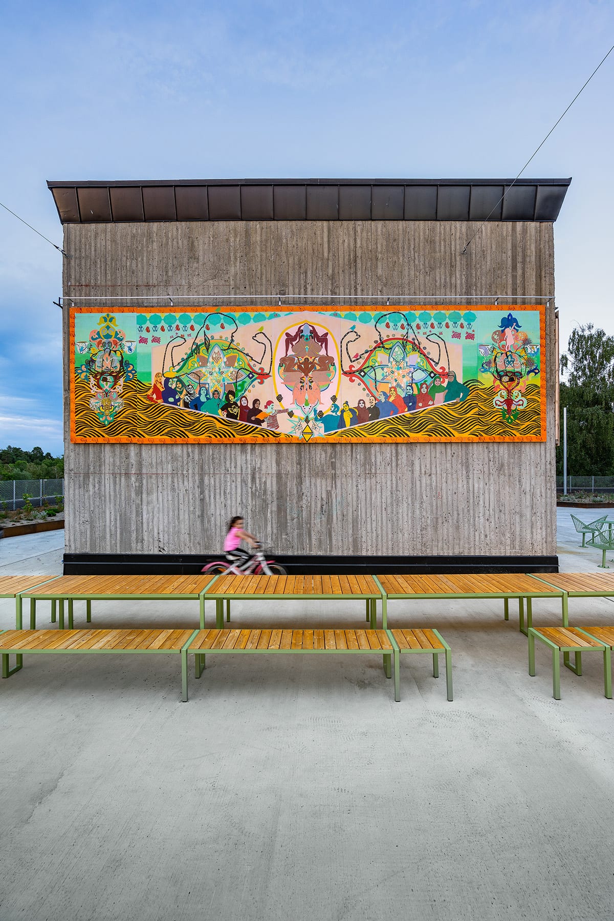 Fittja urban park. Långbordet, in collaboration with White Architects. Korg, designed by Thomas Bernstrand. Photo: Jann Lipka. KONSTKUBEN (the art cube) by living in Fittja. Artistic director Saadia Hussain, Botkyrkabyggen 2015–2020