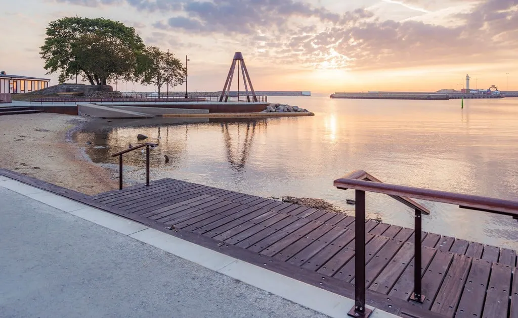 Hamnens material används på ett känsligt och ödmjukt sätt i finstämda terrasseringar och trappsteg. Sandstranden finns kvar som ett mjukt möte med vattnet.