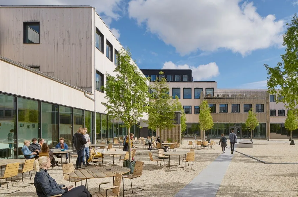 Gården överraskar i sina detaljer: det gula grusets kontrast till det grånande träet i fasaden; trädens skira lövskugga; regnvattnet som tillfälligt blir en stående vattenyta i kalkstensrännan. Teknik, biologi och estetik har vävts samman och resultatet, hela kompositionen, är både poetiskt och funktionellt.