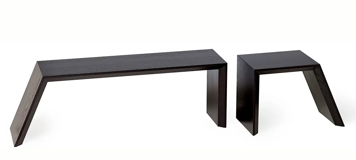 The design developed further and was followed by a larger, updated version in sheet steel. These simple lines have now found it´s equal in a bench with a 114 degree angle and a nook, designed for both public indoors & outdoors or the private garden.