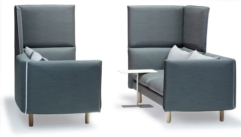 Duo is a sofa that you can fold up around you, just like you turn up the collar on your jacket. The double height shields against noise and disturbances and creates an intimate space for focus, meetings or relaxation. In the unfolded position, the sofa functions as a room divider and as a sound-absorbing element for the surrounding environment, says Andersen.