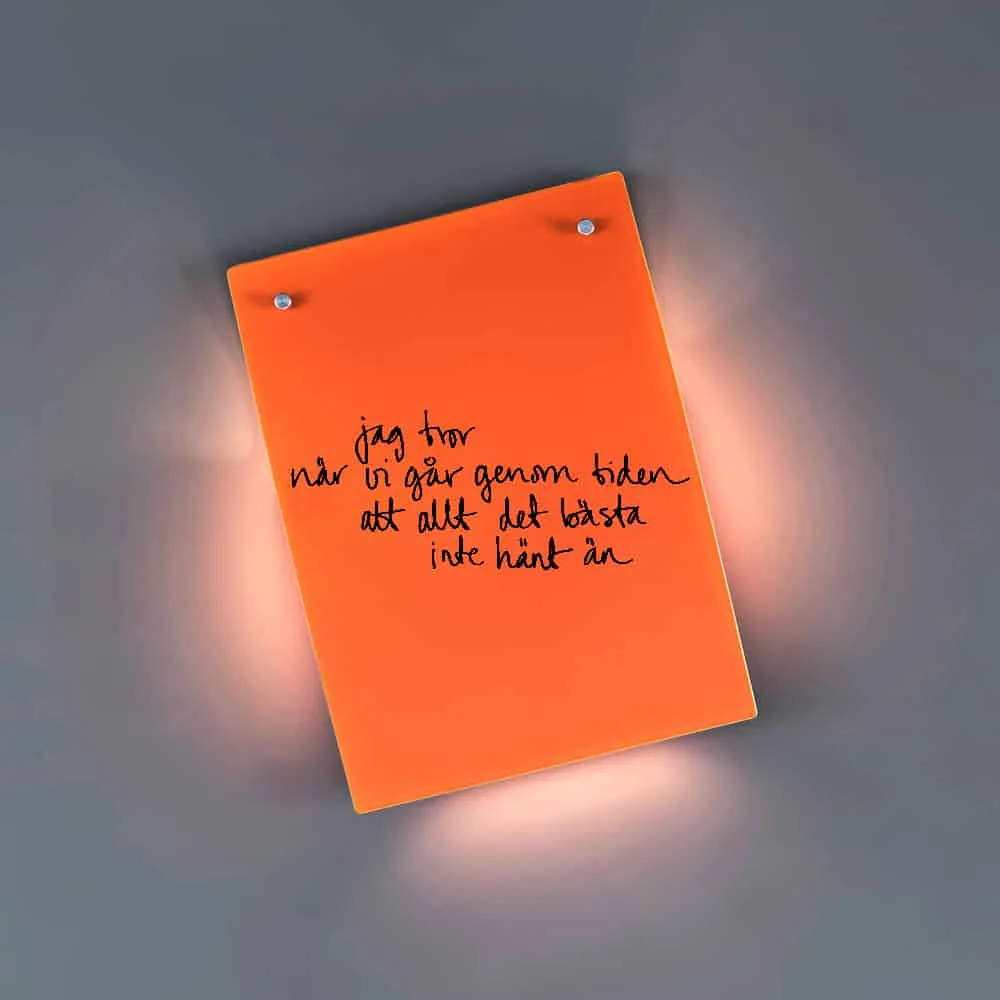Vid första anblicken ett uppnålat pappersark på väggen. Men bakom arket döljer sig en LED-ljuskälla som sprider ett behagligt indirekt ljus. Det spontana uttrycket gör att Note kan monteras på flera olika sätt. Ensam, eller i rad. På olika nivåer, rakt eller lite snett. Och vill man, kan man även skriva en anteckning på den.