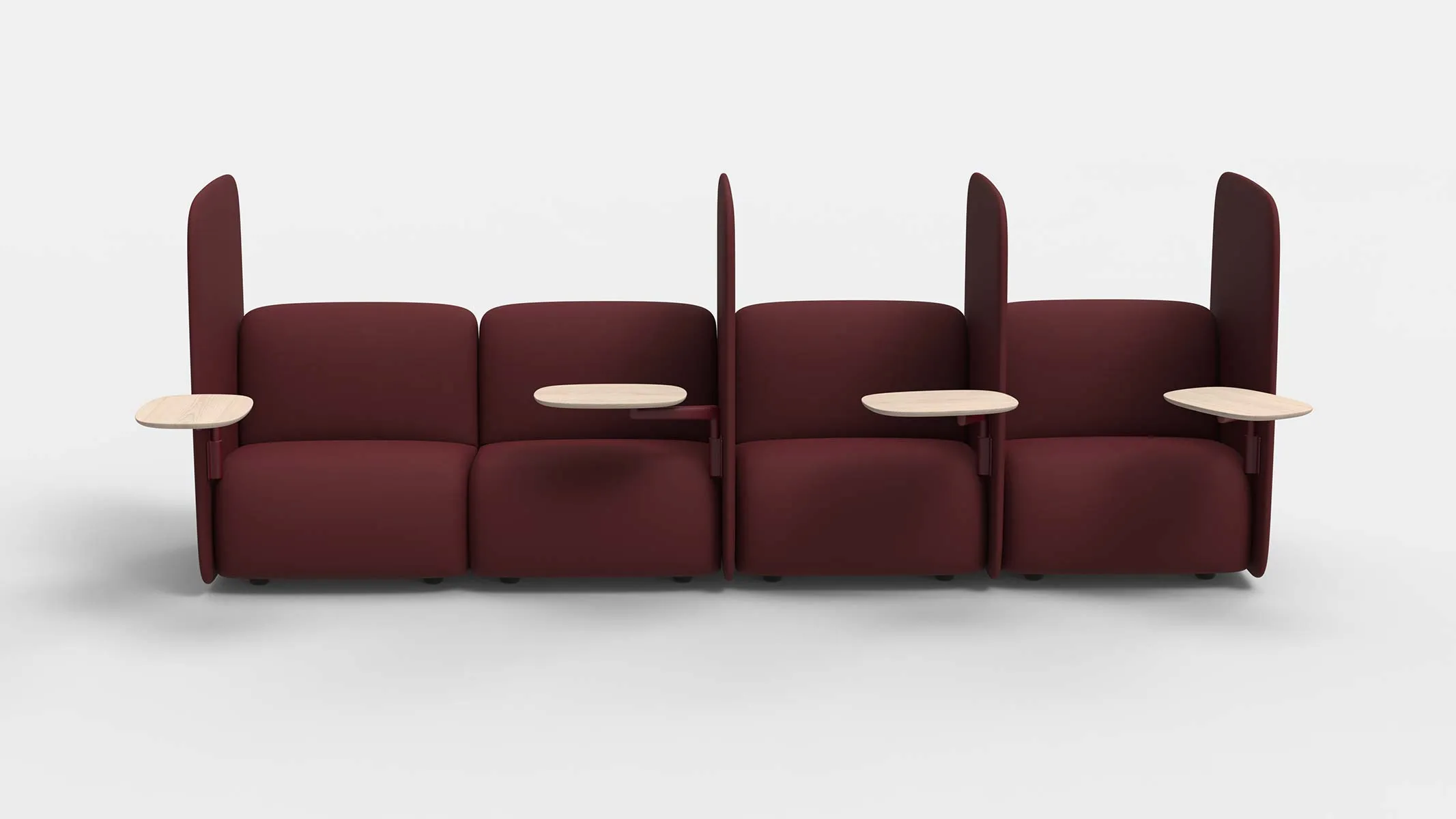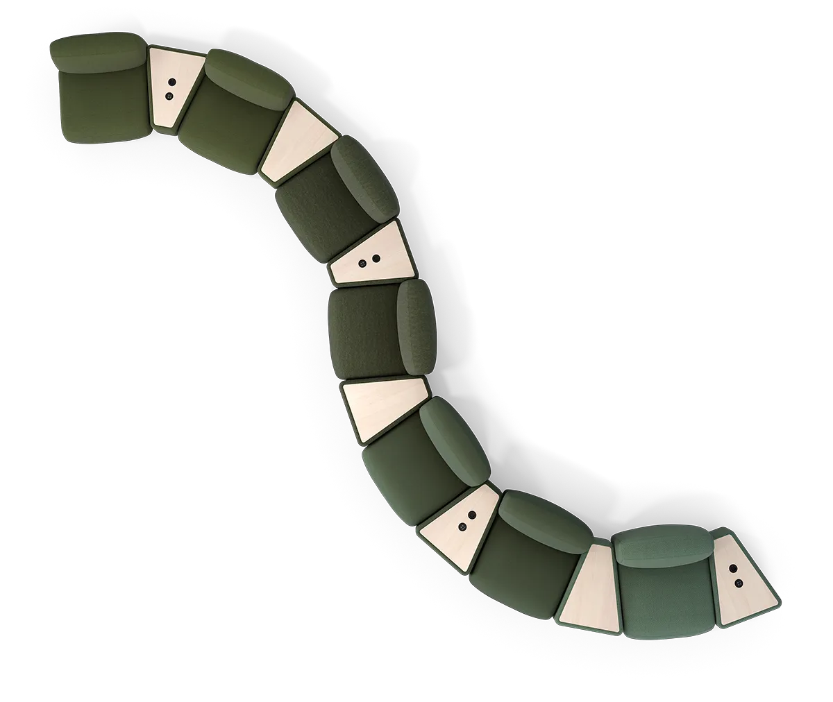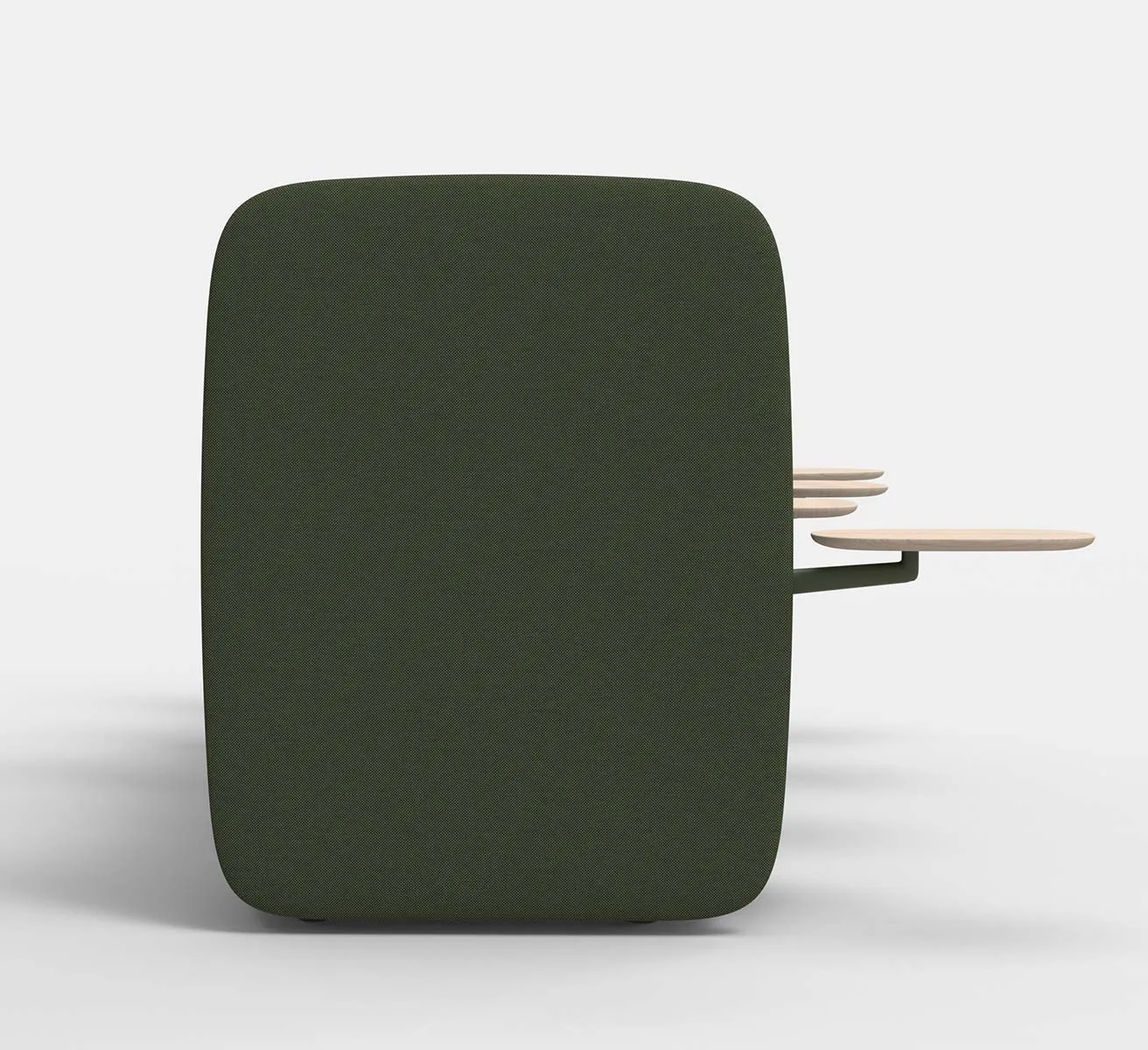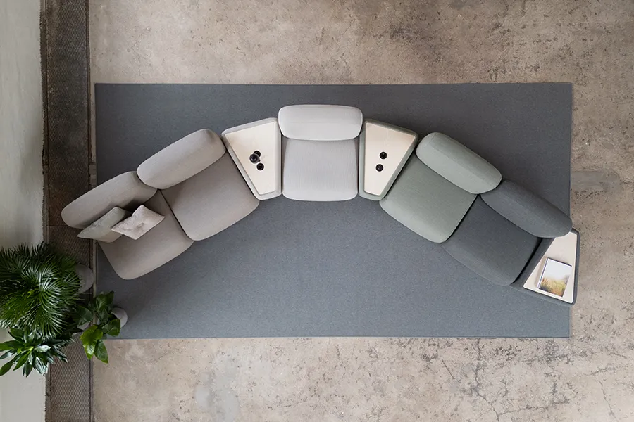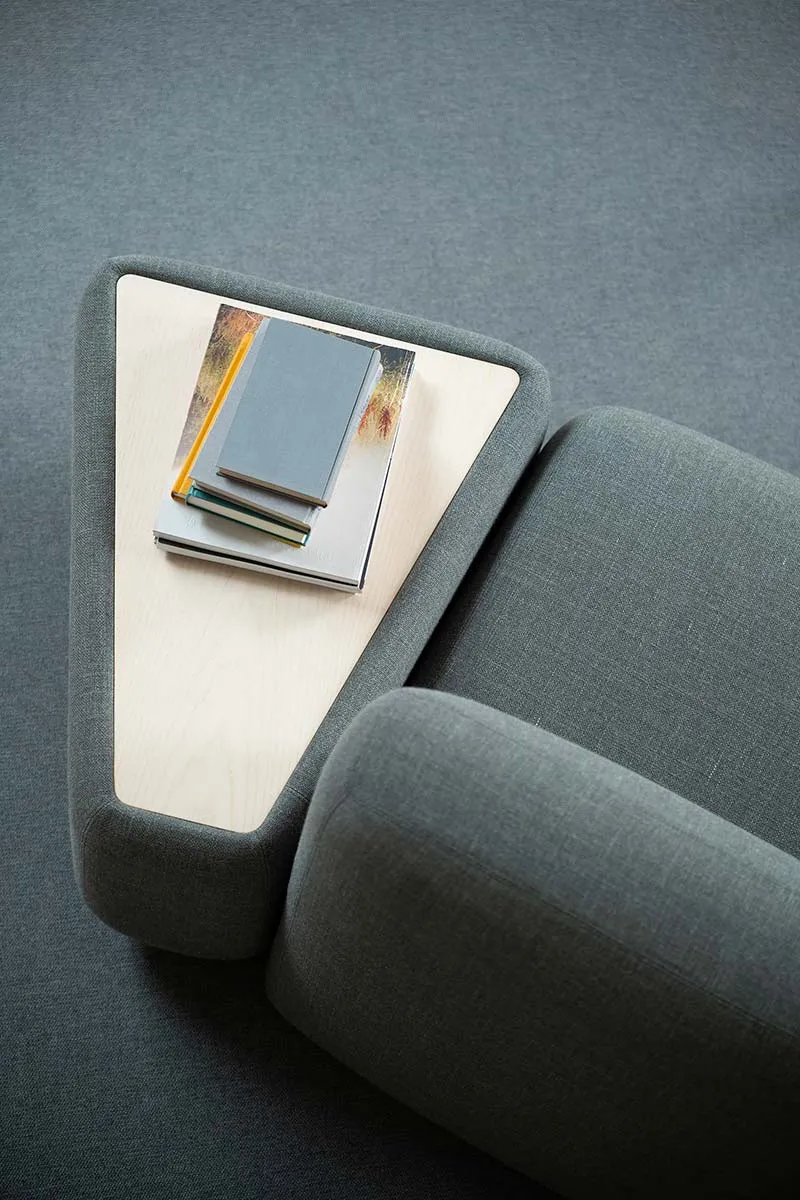 Oas is a generous and flexible modular sofa that invites to creativity. This untraditional workplace has the characteristics of a traditional one, such as the table top for laptops, personal storage, and being close to power outlets.