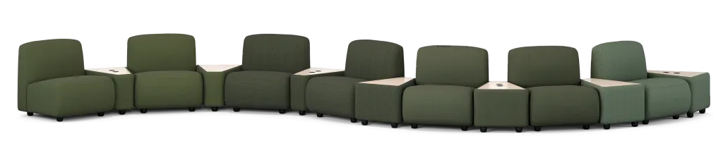 The series includes straight and curved seating units, narrow and wide armrests, a writing tablet, an upholstered screen, different variants of connecting tables and a locker. As sustainability has been an important aspect of the design process, we have used PurFlex® Biomass Balance moulded polyurethane foam. This material helps reduce fossil consumption, while also reducing the carbon dioxide emissions of an OAS seat unit by about 80%. The articulating tablet mount of the writing tablet as well as the recessed box in the wide armrest are available powder coated in one of our carefully selected colours that are part of the Colors by Materia (CbM) concept. The wood is FSC® labelled and comes in white pigmented or black stained ash. The 1-seater and the connecting table 90° can be fitted with castors, making it easy to move. The great versatility of the modular sofa means that it can be configured according to your wishes. The comfortable seating is suitable for many different spaces, such as offices, receptions, and shopping malls. Oas also works as an exclusive lounge sofa for hotels and lobbies.
