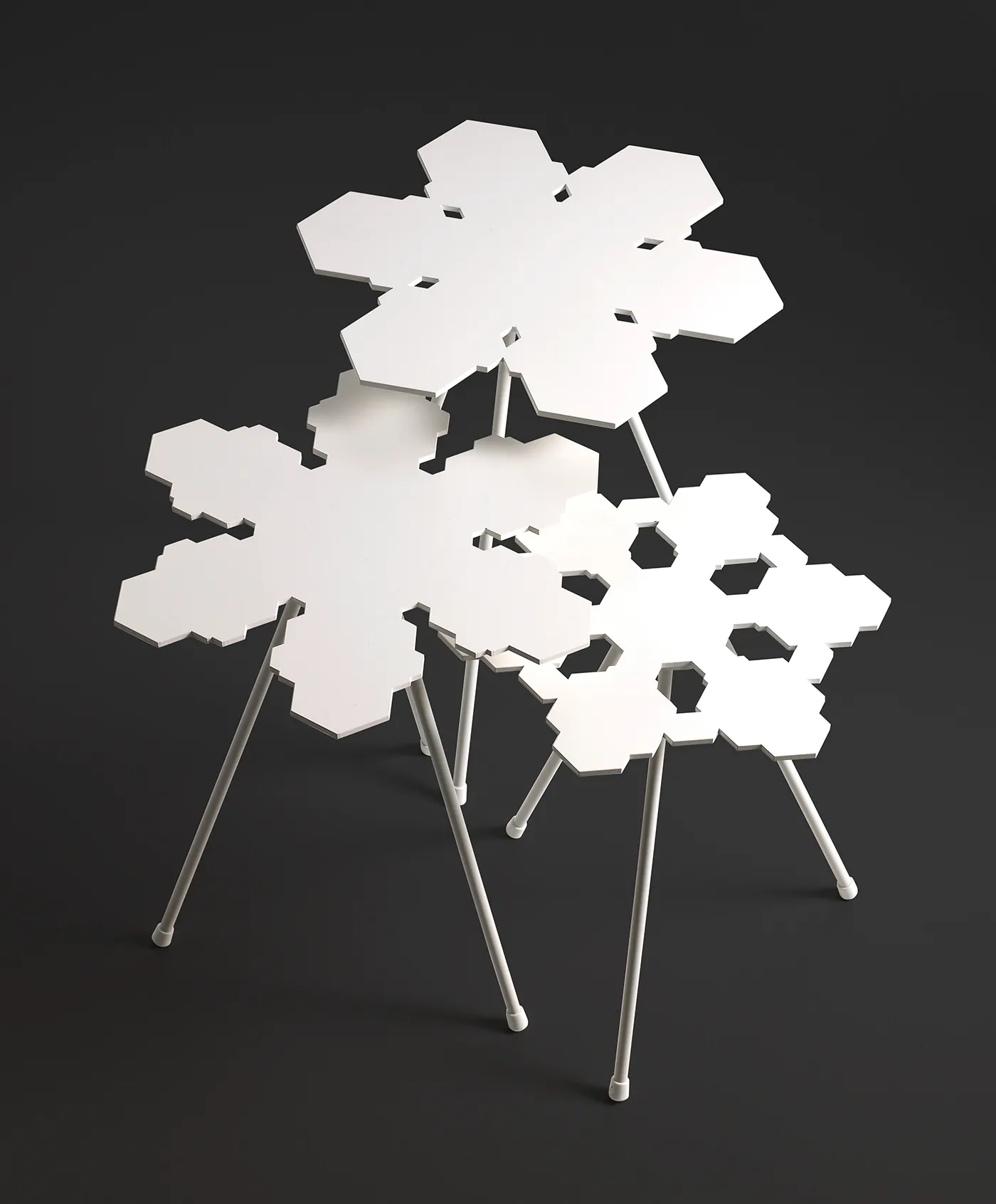 Snowflakes is a small, useful table which can be combined by using several by a sofa or just one by the bed. The table is available in three different heights in order to increase the possible variations and usages. Every table top is unique.
