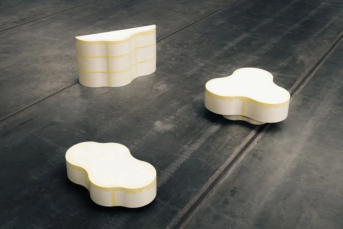 The second interpretation by Lab La Bla is based on an analysis of the production process behind the Flower table, exploring what new design languages can be hidden in a well-proven and specialized process. The tables have been turned, mirrored, extended, and stacked on top of each other – thus interpreted in a completely new design. This shape-shift can be seen as a dialogue between material, shape, and process, where the molded ash wood and the lacquered masking tape create a sketch-like condition.