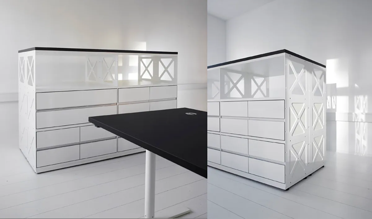 It is a “builder’s system” not like in the 1970’ies, but meeting the demands of today. Mobile and changeable in a super cool design. Standard colours are white and black. The sides are steel plates in either steel colour or white. Fronts are available in strong colours, in glossy laminate or veneer. This is the raw and the exclusive in the combination… pick a choice!