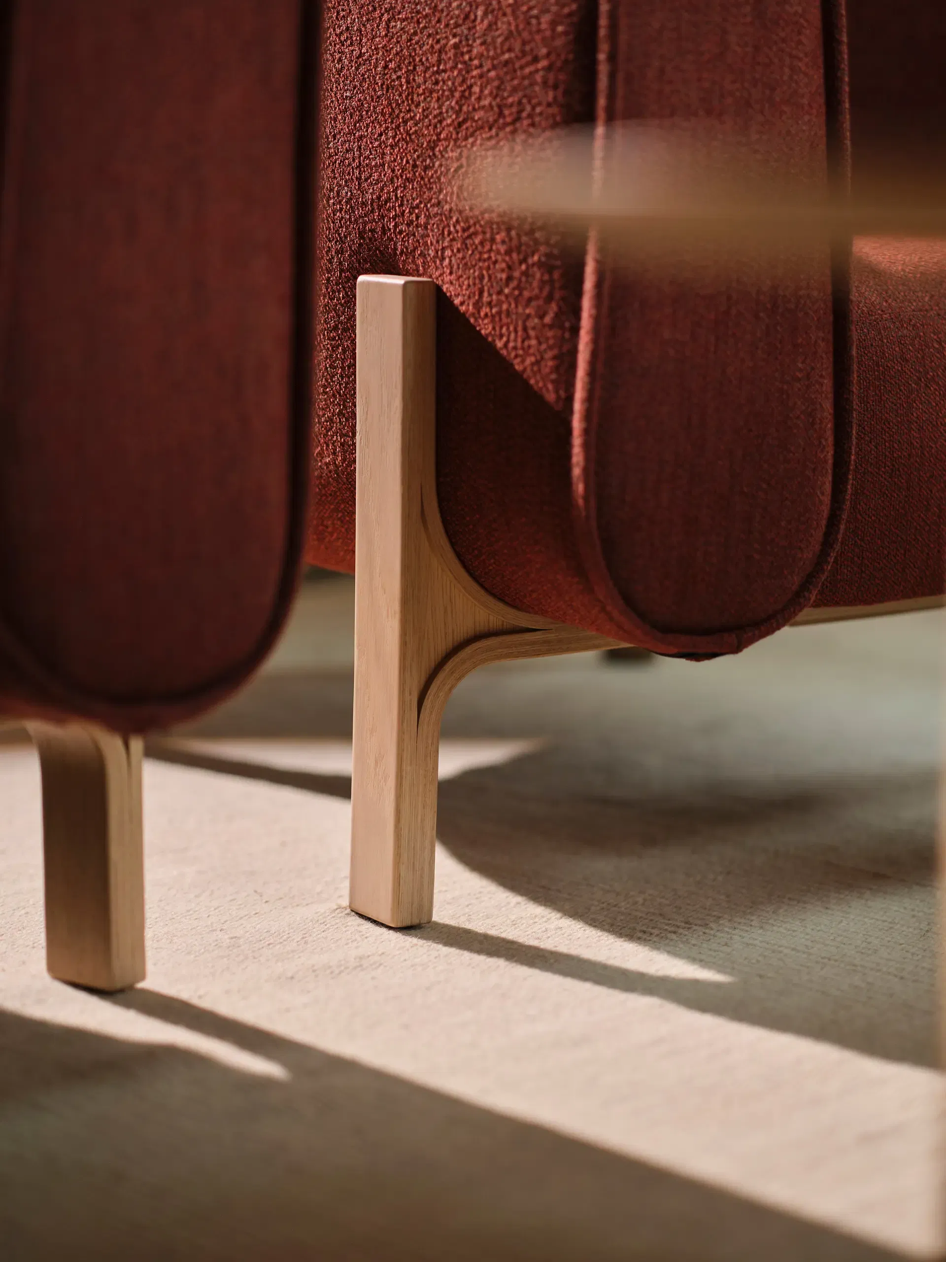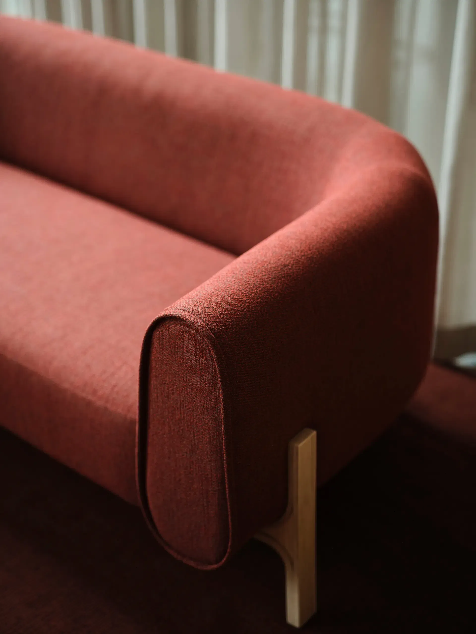 The rounded shapes rest on molded wooden legs that peek out at the bottom and become part of the overall expression, just like the detailed stitching on the armrests.