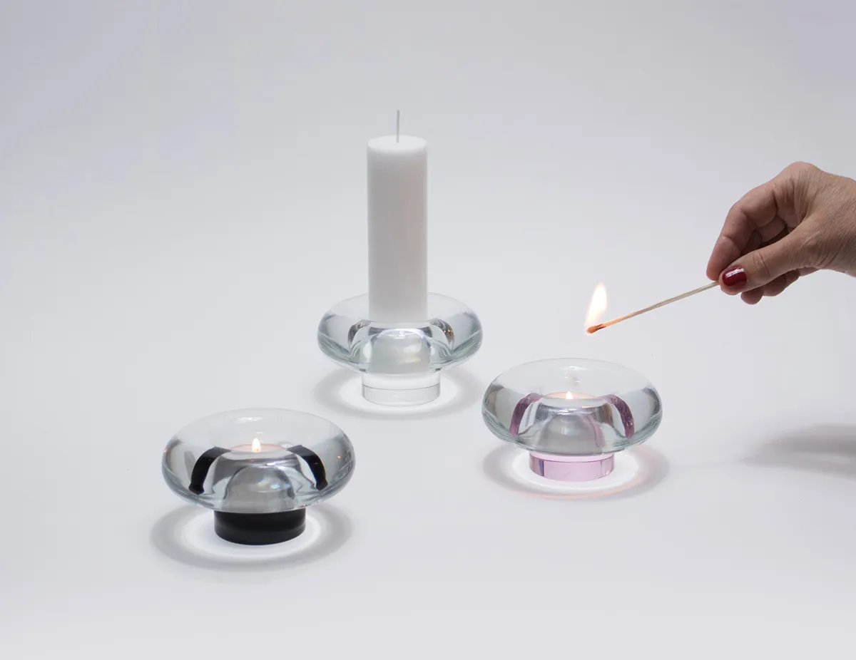 The chunky profile creates sculptural presence while flame reflects through glass, casting rings of light.