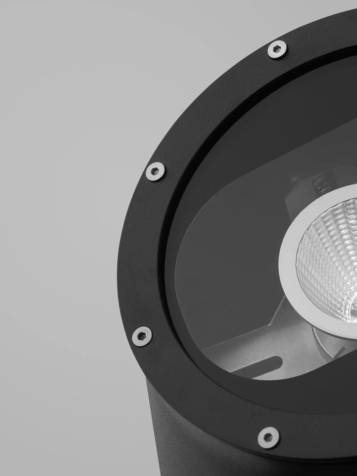 Luminaire housing in sand-cast aluminum and 5 mm thick cover glass in extra impact-resistant polycarbonate.