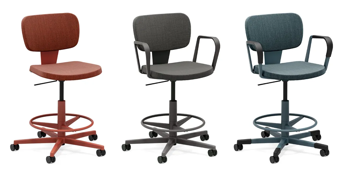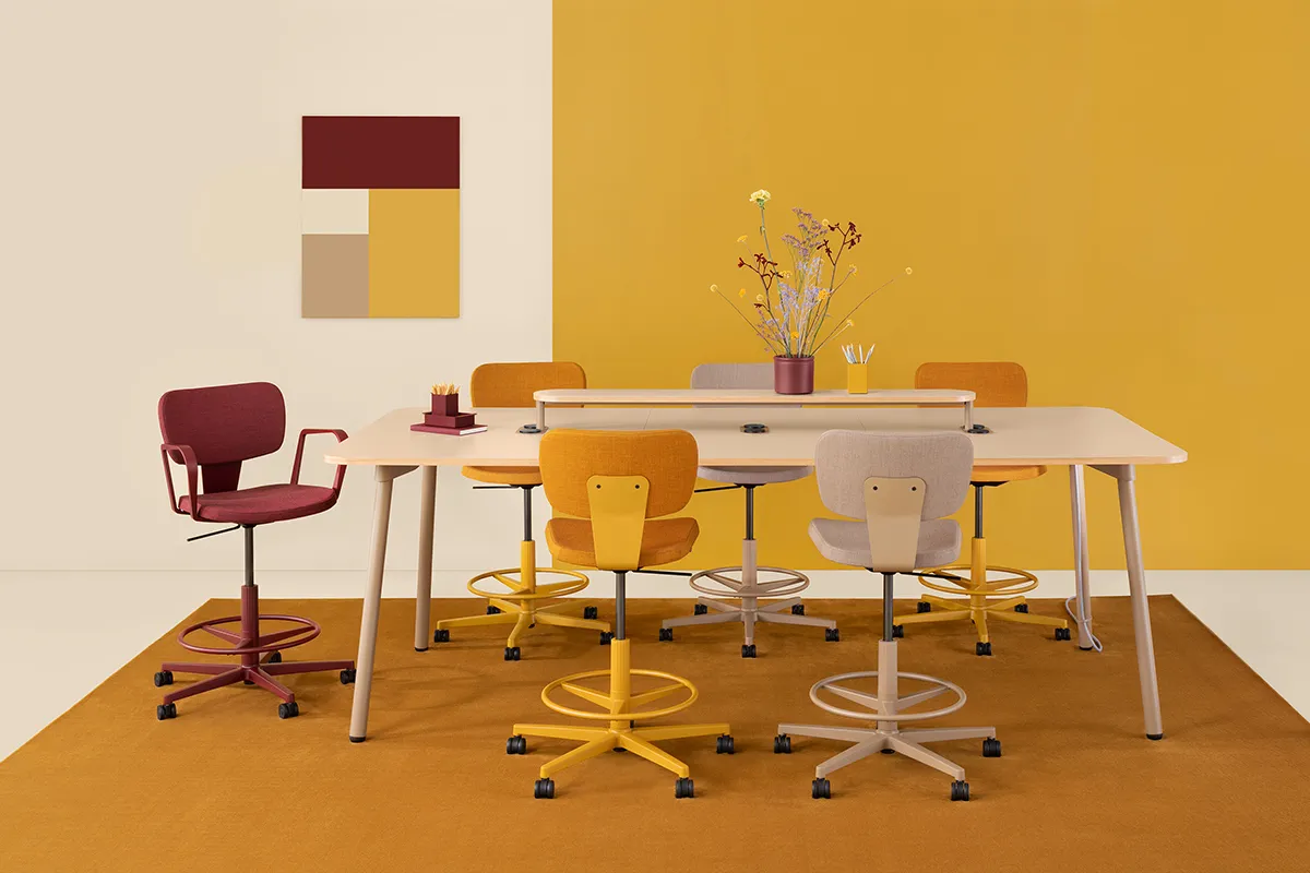 Palette enables ergonomic sitting, a distinct character and a delicate design. The frame with foot support comes with height adjustment between 485-660 mm and lockable tilt function. This higher version therefore invites you to sit more actively and with greater flexibility. Available with or without armrests. Choose between black castors with intermittent brakes or black glides. Frame, armrests and foot support in Colours by Materia. The foot support has a more durable powder coating to withstand heavier use.
