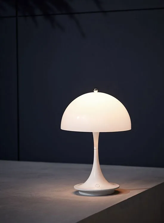 The Panthella Portable lamp comes with a USB-C cable and has three dimming options.The fixture lights up any space harmoniously without glare. The portable table lamp is available in opal, and the transparency of the shade and the reflection of the downward light on the inner side of the shade provides a gentle light and subtle ambience.