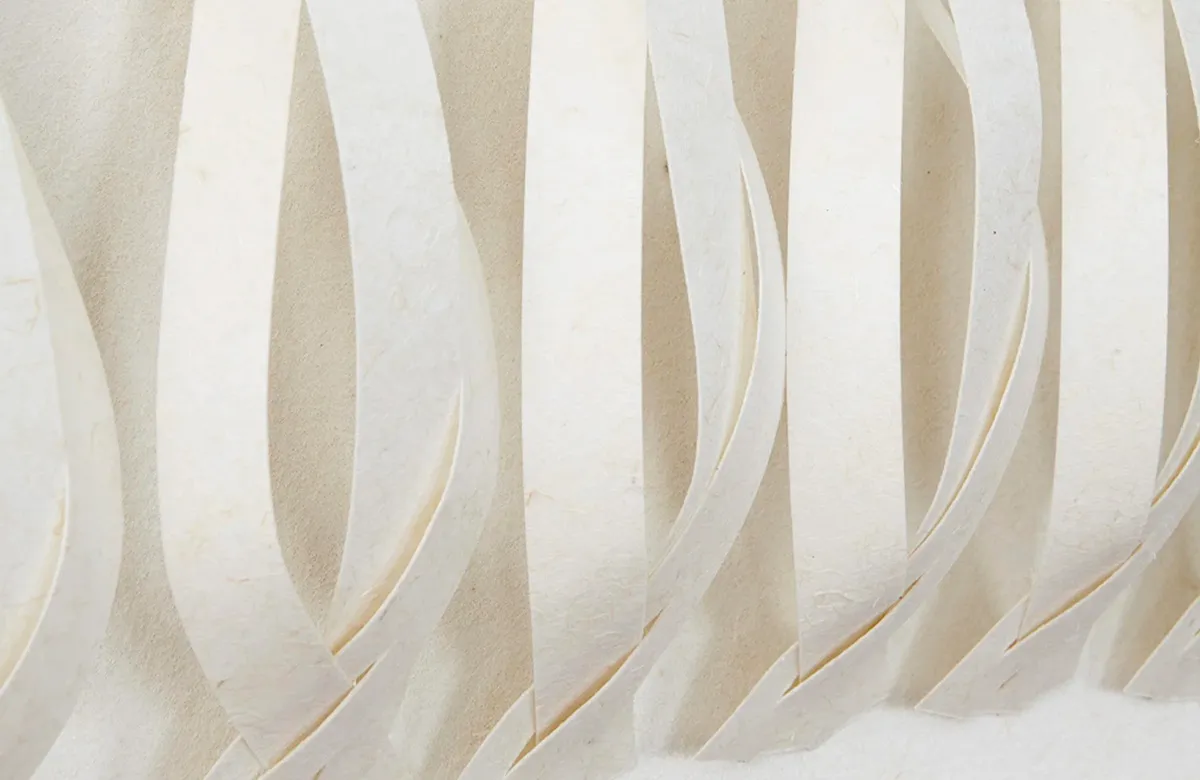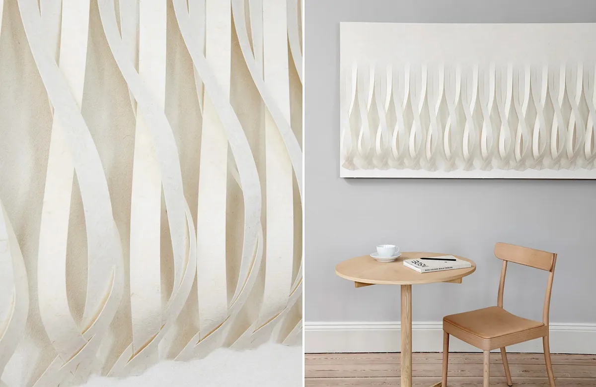 With the hemp fiber’s soft and pliable nature, combined with its reminiscence of both a soft textile and a firm paper, Anna has found a way to achieve volume and an airy sculptural sense of calm and light energy that Parallel Lines expresses. An acoustic relief that creates calm both with its sound-absorbing properties and with its elegant artistic expression.